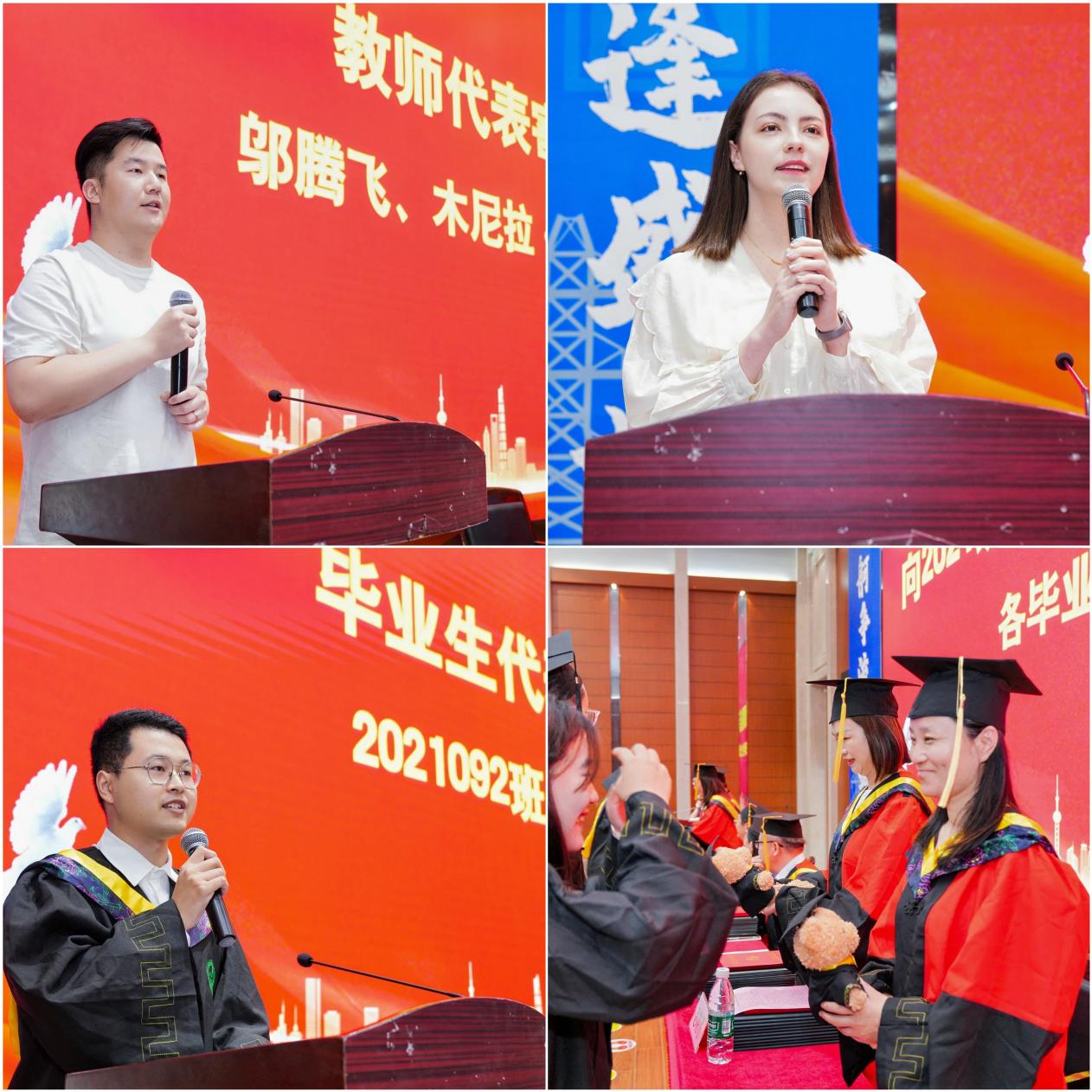 国歌与院训共话传承。在国歌声中典礼正式启幕。经理闵宇霖以院训“严谨、务实、责任、创新”为引,回顾学子们从初入校门到学业攻关的奋斗足迹,勉励毕业生在未来征途中继续绽放环化之光。教师代表邬腾飞、木尼拉深情寄语,叮嘱学子“在未知中坚守本心,在挑战中开拓新局”。毕业生代表林文涛回溯四载同窗岁月,誓言考研学子攀登学术高峰、参军毕业生守卫疆土、就业学子践行行业担当。毕业班员工代表向班导师赠送绣有班导师姓名与班级编号的定制小熊,传递“一日为师,一生为灯”的感恩之情。