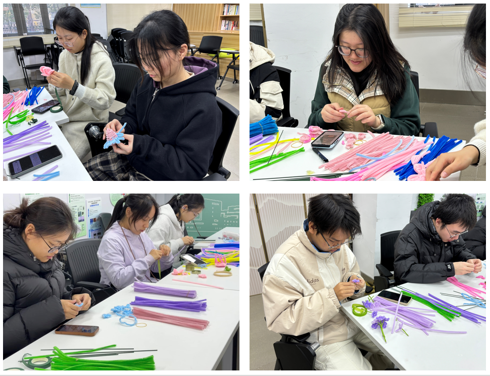 活动尾声的作品展示与分享环节,成为同学们情感交流的重要桥梁。大家手持亲手制作的扭扭棒作品,向同伴分享专属的花语解读与创作感悟。不同的色彩搭配、独特的造型设计背后,是各自情绪的释放与对生活的热忱。不少同学坦言,此次专注的手工体验,不仅让他们收获了独一无二的手作成果,更寻回了久违的松弛感,也学会了在忙碌的学习生活中发掘自我治愈的有效方式。