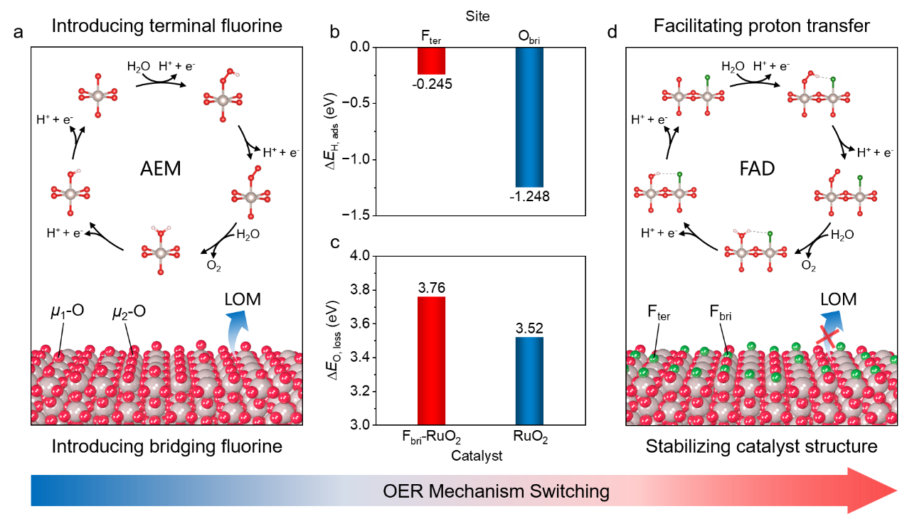 本工作针对质子交换膜电解水制氢阳极析氧反应(OER)中传统铱基催化剂成本高、效率低的“卡脖子”难题,创新性地设计开发了一种氟调制氧化钌催化剂。通过在催化剂中同时引入末端氟位点和桥接氟位点,巧妙地触发了一种全新的“氟辅助去质子化”机制。该机制成功将OER中的质子转移过程与电子转移过程解耦:末端氟位点充当“质子中继站”,显著加速各反应中间体的去质子化步骤,从而提升反应活性;桥接氟位点则有效抑制晶格氧参与反应,从而大幅增强稳定性。