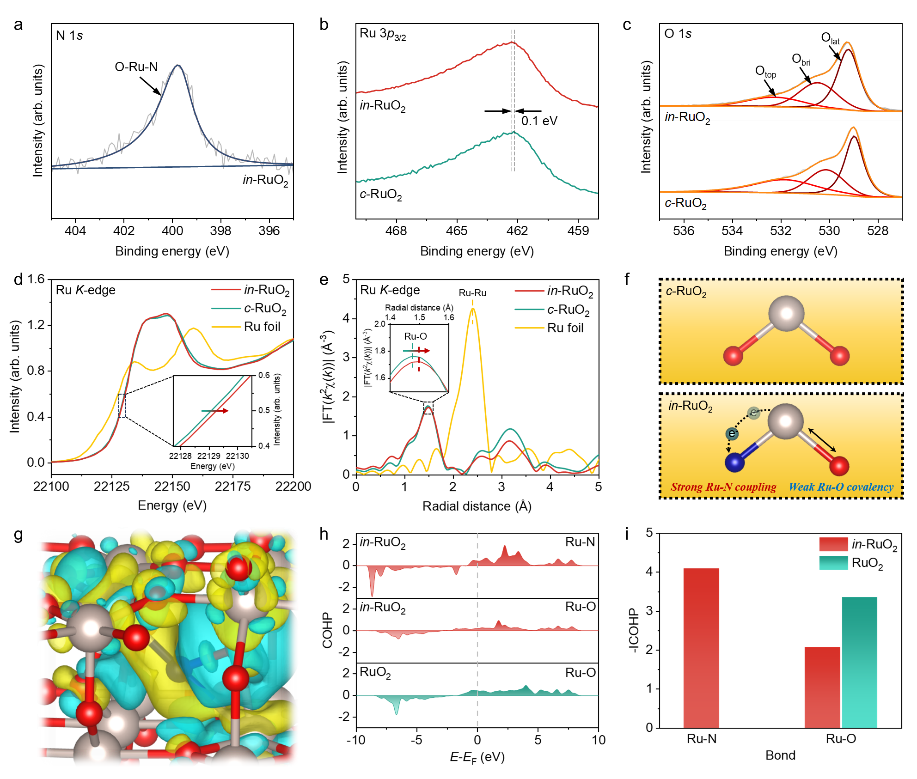 所制备的催化剂在10 mA cm-2电流密度下过电位仅为195 mV,且能稳定运行超过1000小时几乎无活性衰减。先进谱学表征与理论计算证实,氮掺杂形成的强Ru-N电子耦合与弱Ru-O共价性,在产生高价钌位点的同时抑制了其过氧化溶解及晶格氧析出,从根本上提升了催化剂的耐久性。深入的电化学分析与原位测试发现,高价钌位点的存在加速了催化剂表面的电荷积累,不仅促进了中间体化学键的断裂与形成,还优化了界面水的取向与组成,显著提升了反应动力学。以该催化剂为阳极的实际电解池仅需1.79 V即可达到1000 mA cm-2的工业级电流密度,并稳定运行至少300小时,展现出巨大的应用潜力。