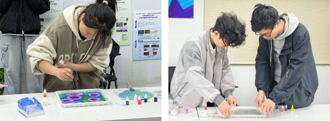 在实践环节,同学们化身“化学艺术家”,亲手调配颜料,控制滴加顺序与力度,观察并引导色彩在水面因表面张力与流体动力学作用形成的独特纹样。从胶体溶液的制备到界面图案的精准拓印,整个过程宛如一场精妙的化学实验。当丝巾轻覆水面,水中的瞬间图案被永久固定,这一“转印”步骤也蕴含了丰富的材料表面处理原理。
