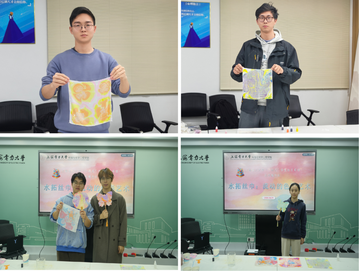 同学们创作出的每一幅独一无二的丝巾作品,不仅是艺术表达,更是一次成功的“化学应用”成果展示。活动不仅让同学们体验到非遗手作的乐趣,更搭建了一个以趣味实践反观专业理论的平台。同学们在交流创作心得的同时,也自发探讨了活动中涉及的化学现象,实现了从“知识接收”到“兴趣探索”的积极转变。