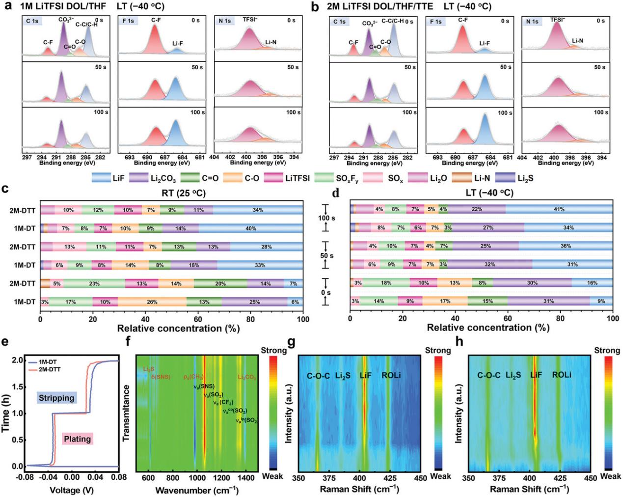 本研究设计了一种局部高浓醚类电解质体系,通过锂盐浓度调节溶剂化结构,形成一定数量的接触离子对(CIPs)和离子聚集体(AGGs),加速了锂离子的去溶剂化,从而在锂负极上形成更致密稳定的有机-无机SEI,提高了电荷转移速率和高压充放电性能。实验结果表明,装配该电解质的Li||Cu对电池工作时间超过400小时,并保持98.05%的平均库仑效率,即使在−40°C下,Li||NCM811全电池也能够进行100次稳定循环,容量保持率为93.7%。上述发现证实了离子配对和阴离子衍生的SEI对锂金属电池长循环的影响,为低温高压锂金属电池的发展提供了有前景的解决方案。